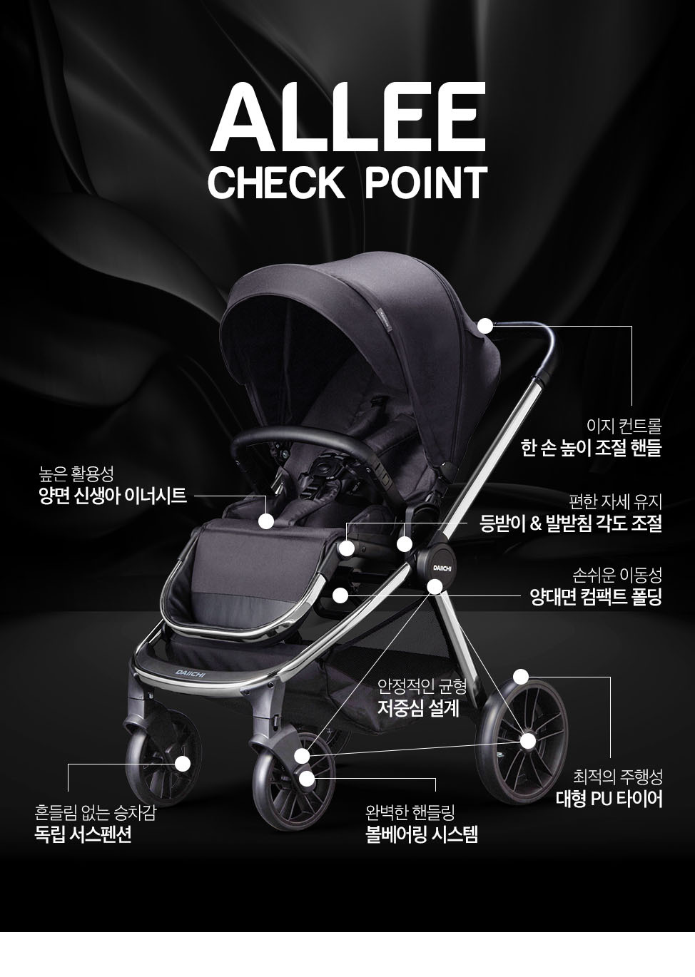 | 다이치 더 프라임 하이엔드 | 890,000~1,050,000 | 다소 무거움 | 29cm 대형휠 + 고탄성 서스 | 양대면 폴딩 | 승차감·턱 넘김·저중심 안정성 | 크기/무게·보관공간 필요 | 노면 안 좋은 동네/돌길·턱 많은 환경 |