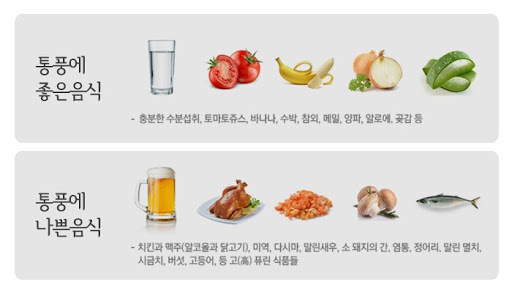 | 수분 | 물(하루 1.5–2L 이상, 나눠 마시기) | 소변량↑ → 요산 배출↑ |