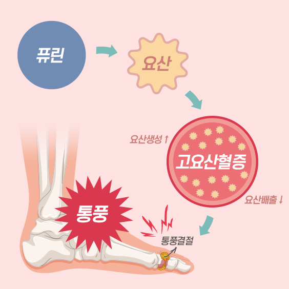 - 생성 경로: 음식·체내 퓨린 → 분해 → 요산 생성 → 신장 배출