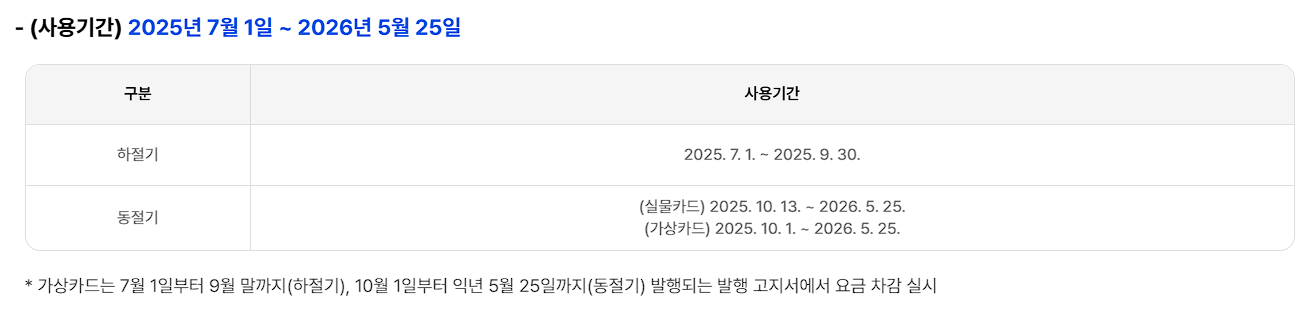 - 동절기 사용: 요금차감 2025.10.01 ~ 2026.05.25, 국민행복카드 2025.10.13 ~ 2026.05.25