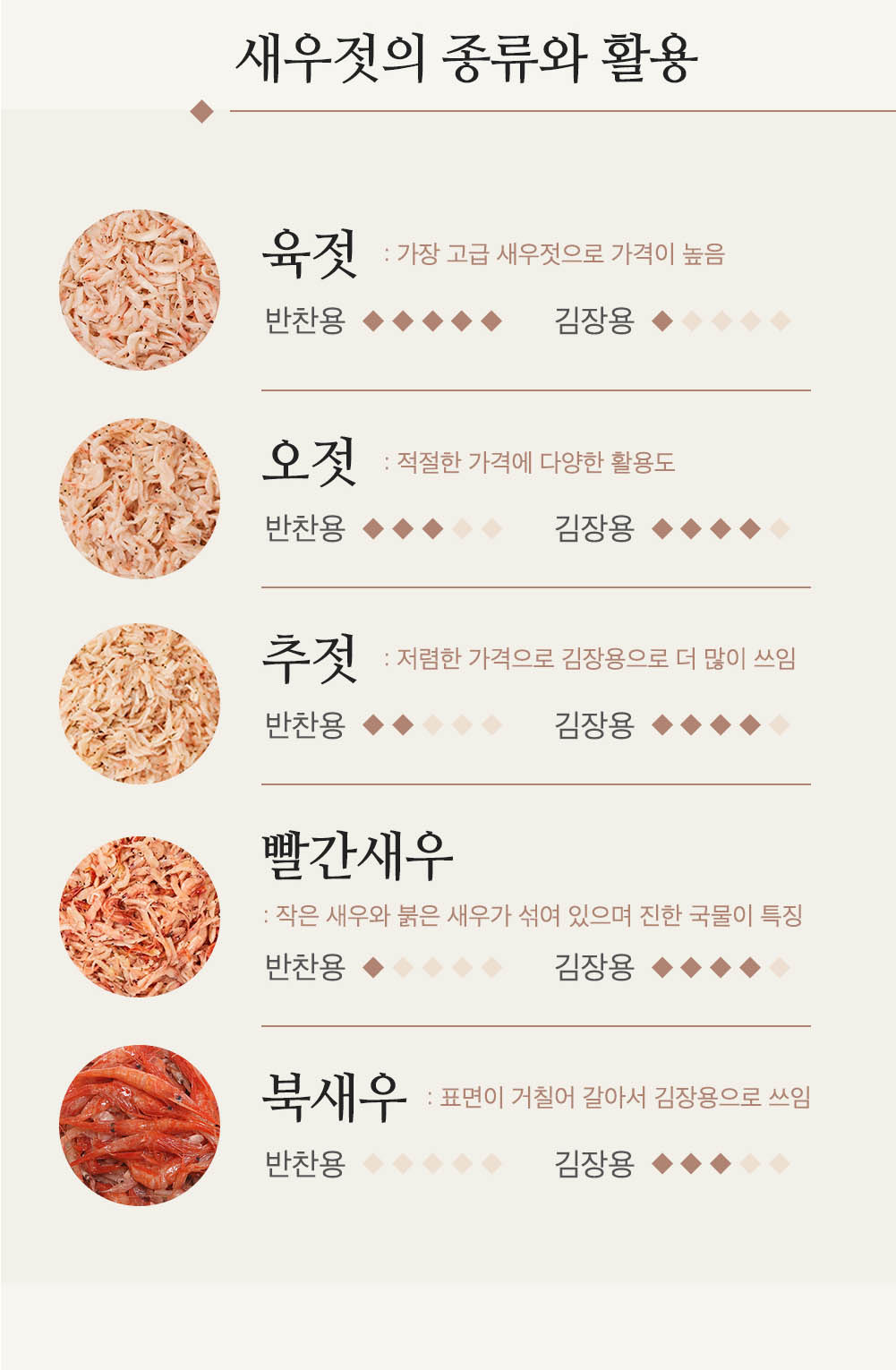 - 육젓(음력 6월): 새우가 가장 크고 살·알이 꽉 찬 최상급. 진하고 고소한 감칠맛 → 김장 속재료, 돼지수육·보쌈 양념에 최적