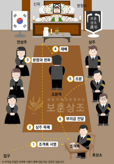 - 절차: 방명록 → 헌화/분향 → 두 번 절(또는 묵념) → 상주 위로 → 정숙 퇴장.