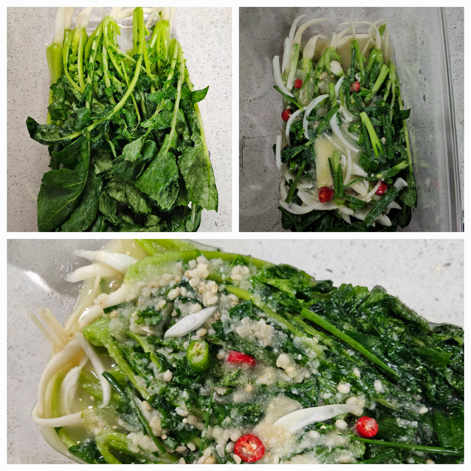 - 대량 레시피(열무 3kg): 고춧가루 20~22T / 액젓 180ml / 마늘 8~9T / 매실액 120~140ml / 생강가루 1/2T / 찹쌀풀(물 4~4.5컵+가루 4~4.5T)