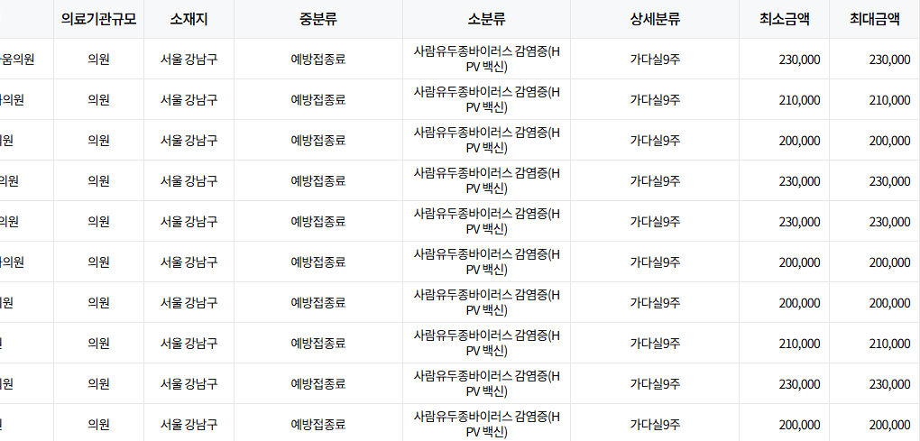 가다실 9는*비급여(보험 미적용)입니다. 그래서 병원별 편차가 아주 큽니다.