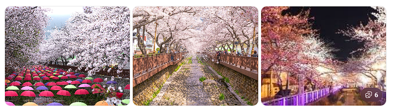 4월이면 가장 먼저 떠오르는 대표 봄 축제가 바로 진해 군항제입니다. 매년 4월 중순 즈음 열리며, 전국에서 관광객들이 찾아올 만큼 큰 규모를 가진 축제입니다. 진해 군항제의 핵심 명소는 여좌천 벚꽃길로, 약 1.5km의 벚꽃 터널이 장관을 이룹니다. 드라마 ‘로망스’ 촬영지로 알려진 로망스 다리 역시 많은 사람들이 사진을 찍기 위해 찾는 스팟입니다.