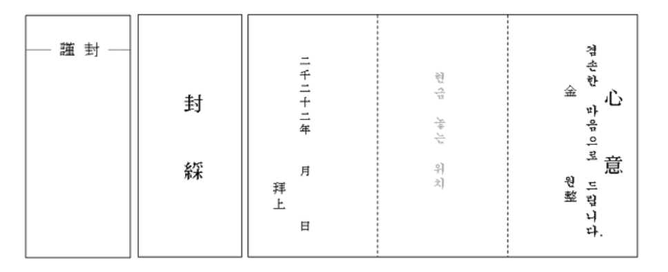 - 내지: 3등분하여 가운데에 현금을 넣고, ‘심의(心意)’라는 글자와 금액을 기재