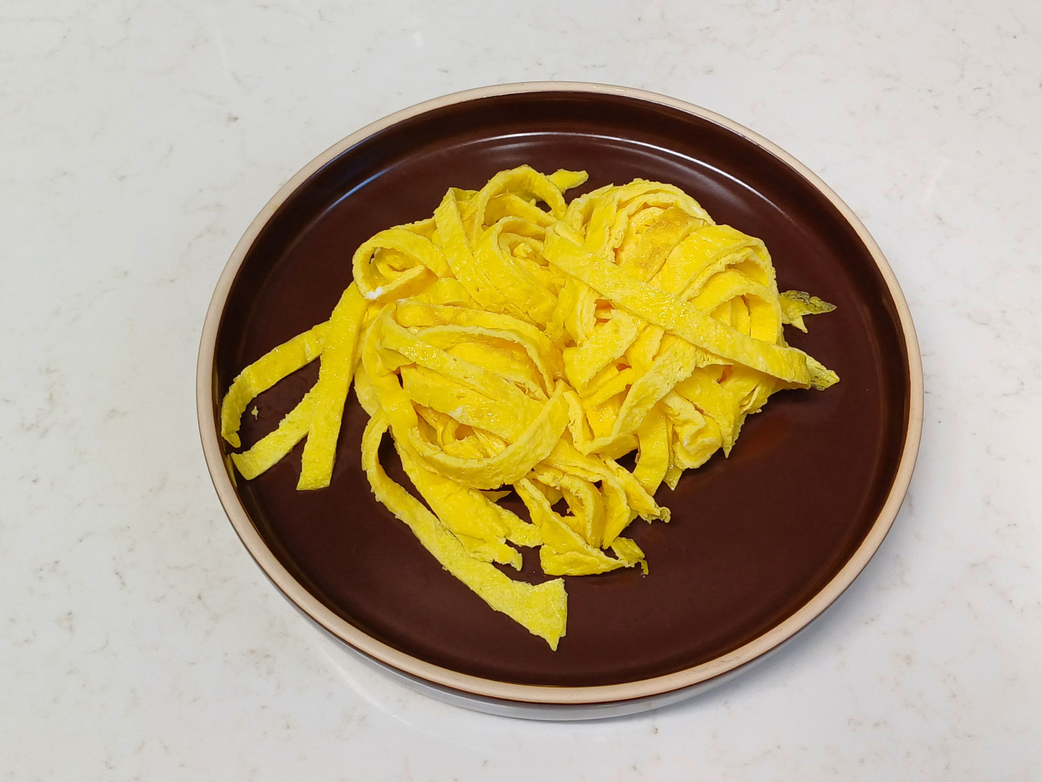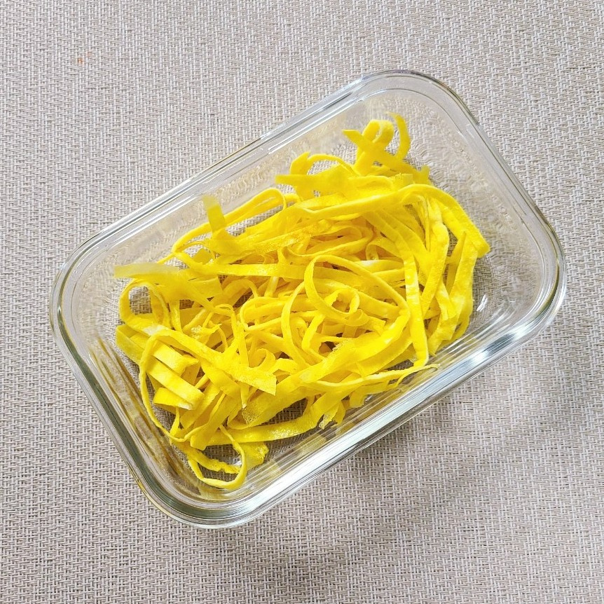 - 식은 지단은 돌돌 말아 얇게 채 썰어 고명용으로 준비합니다.