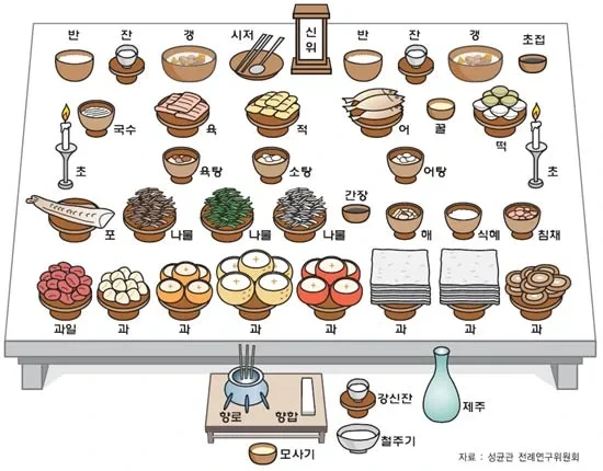 음식은 홀수로 준비하는 것이 원칙이며, 복숭아·마늘·고춧가루처럼 귀신을 쫓는 의미가 있는 음식은 사용하지 않는 것이 전통입니다.