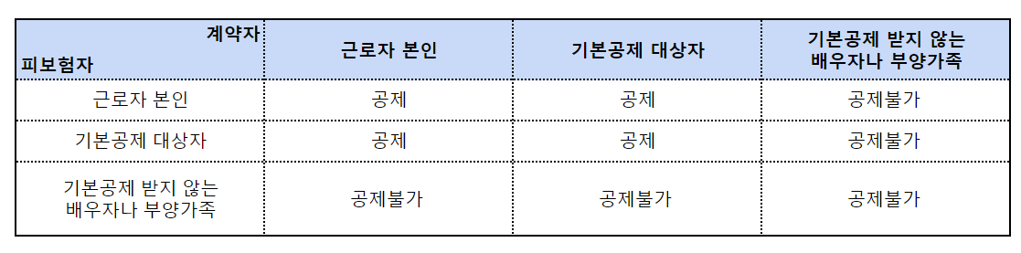 - 소득 없는 가족 명의 계약이어도 근로자가 실질 납부하면 공제 가능(기본공제대상자 피보험 조건).
