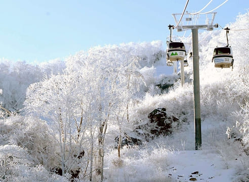 등산 초보자라도 걱정 없습니다. 무주 덕유산 리조트에서 운영하는 곤돌라(관광 케이블카)를 타면 해발 1,520m 설천봉까지 쉽게 올라갈 수 있습니다.